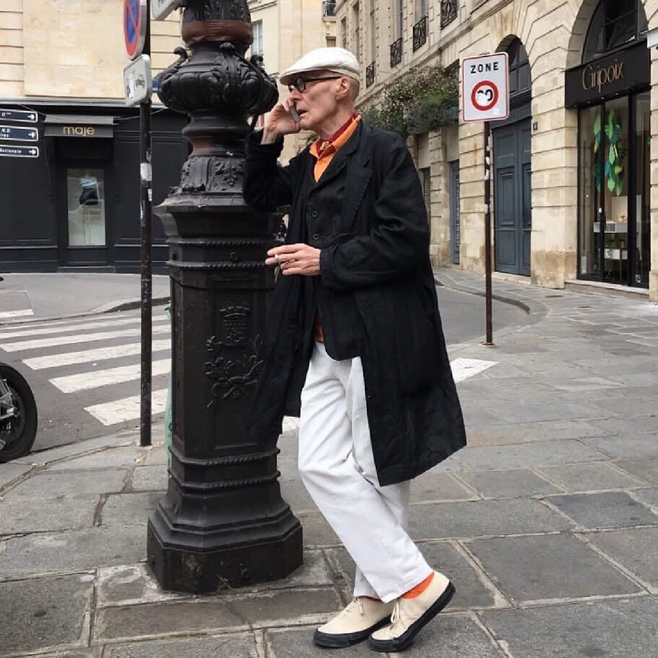 わたしは、白Tシャツとアナトミカの定番トラウザーズであるTANGOを組み合わせましたが、ピエールさんは帽子とトラウザーズに白を組み合わせておられます。