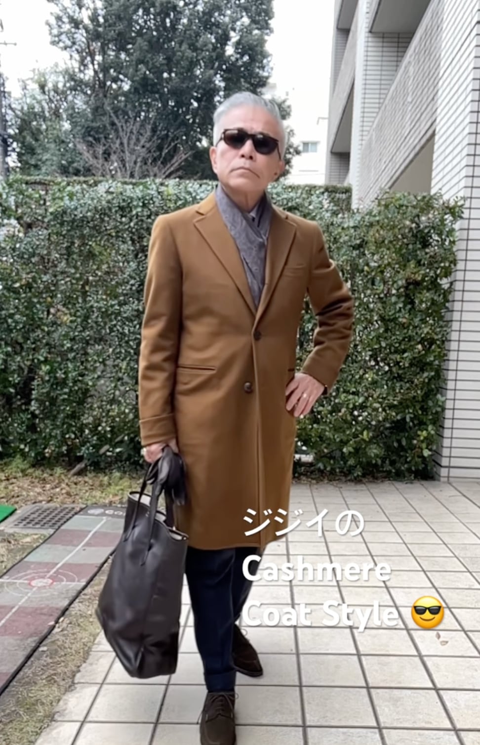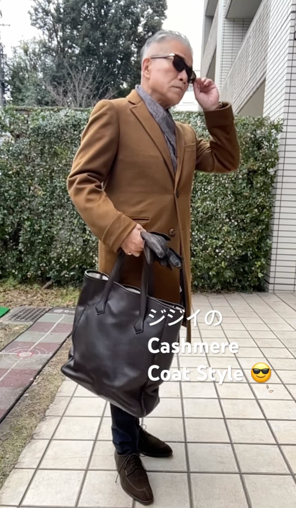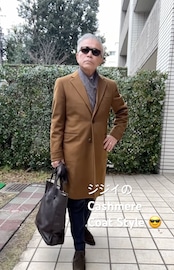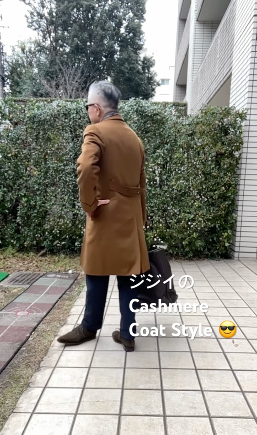 通常、ポロコートといえば、ダブルブレステッドでスポーティーな印象ですが、生地をキャメルカラーのカシミヤ、袖のターンナップと後ろのベルトはポロコートの仕様を残しつつ、襟元をシングルにしてオーダーしたので、チェスターフィールドコートとポロコートが1着で2度楽しめる感じです。