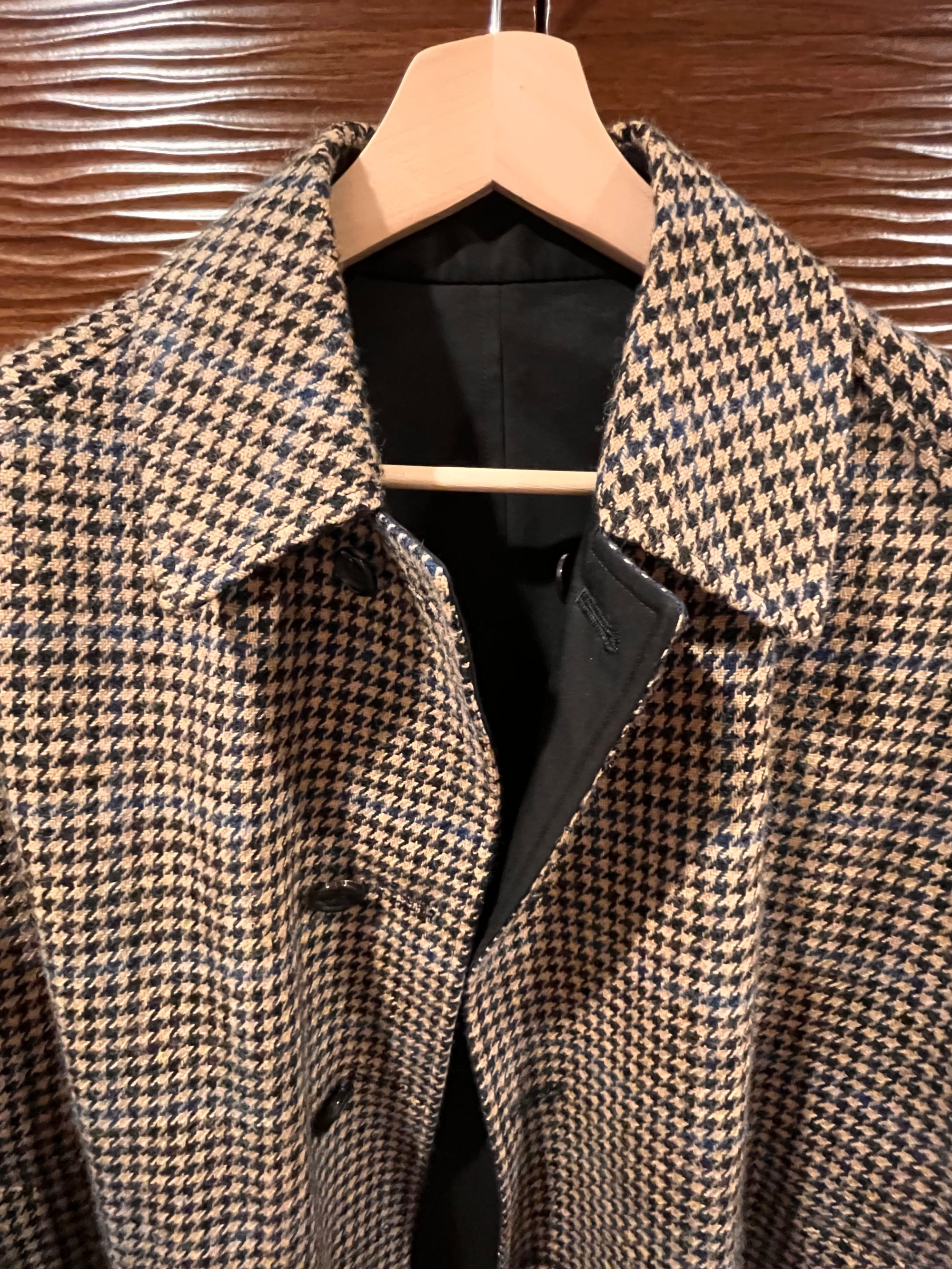 ブラック×ナチュラルの千鳥格子にブルーのオーバーチェックが入るツイード生地のリバーシブルは、アナトミカパリのオーナー、ピエール・フルニエさんが愛用していた英国製の生地をアナトミカ日本が復刻させたものです。とても丈夫なツイード生地なので一生愛用できると思います。